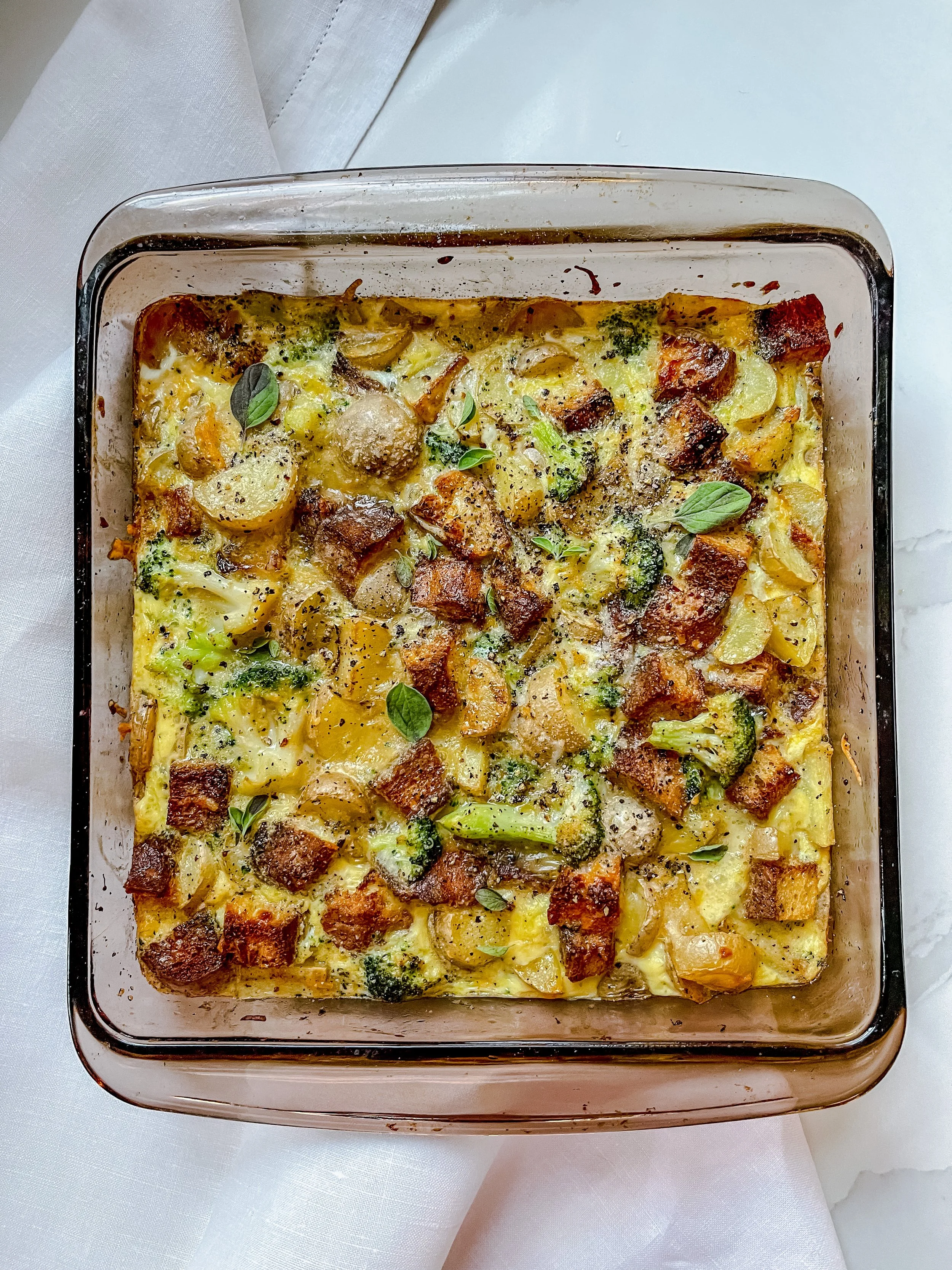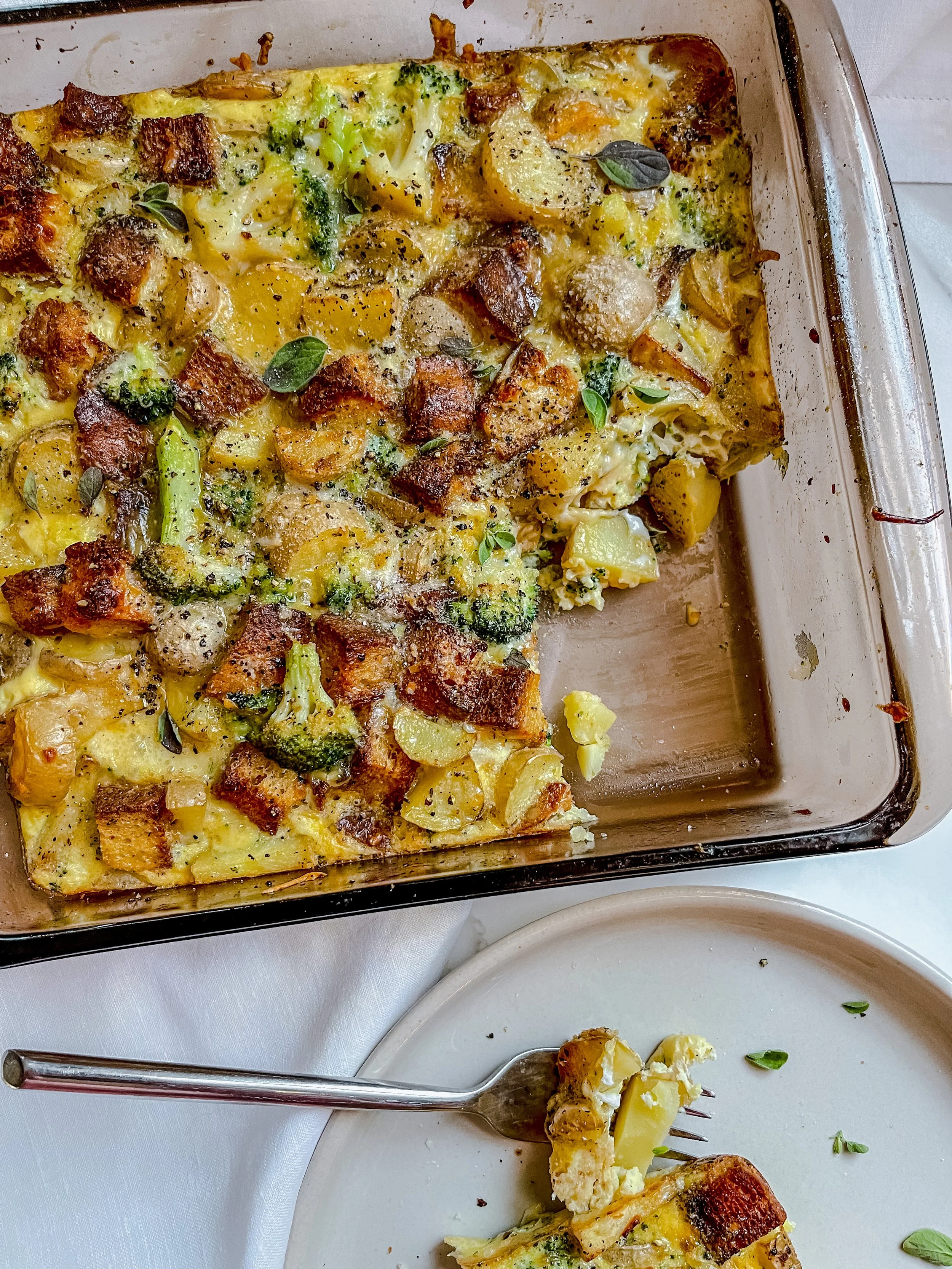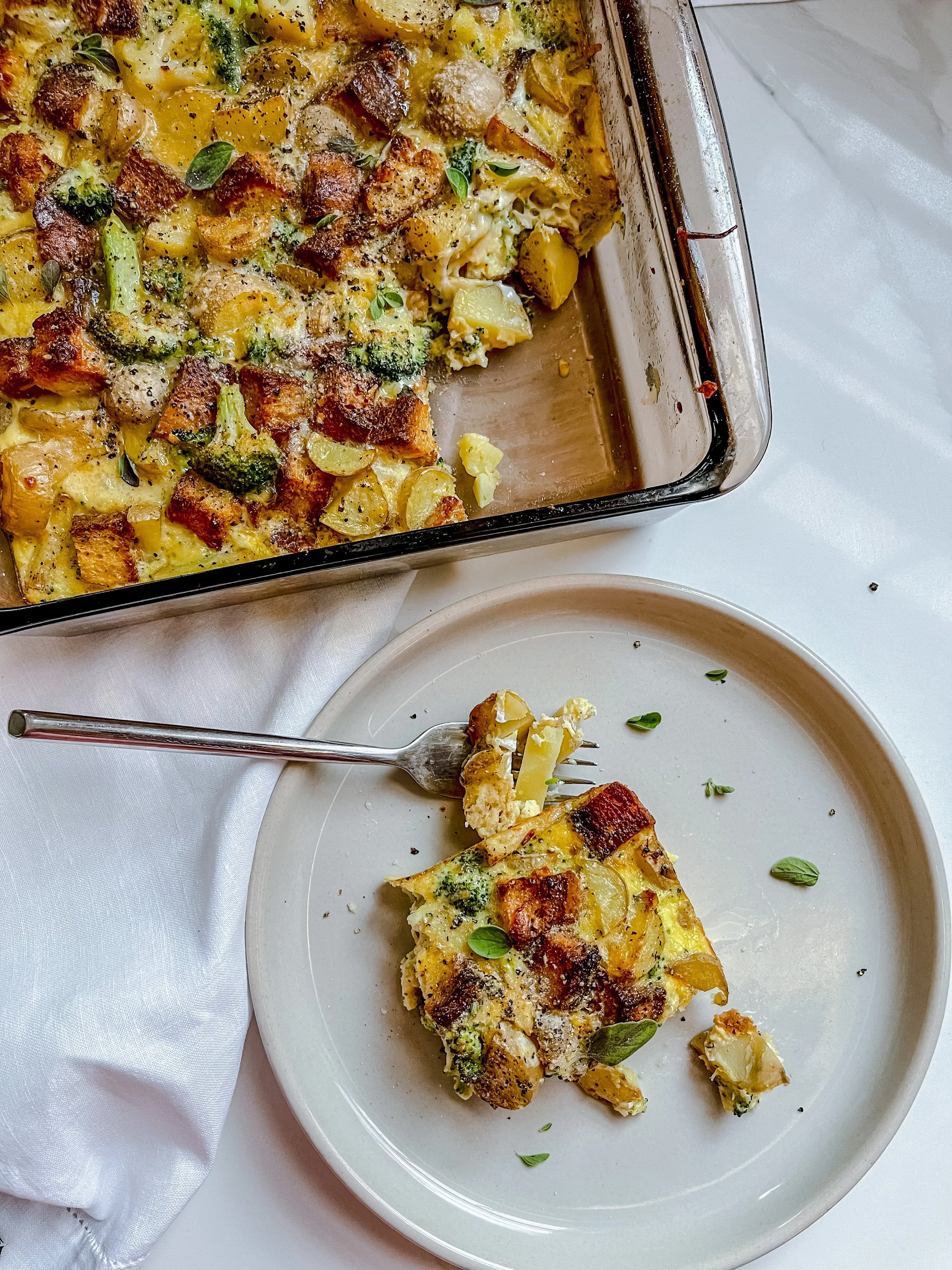 I love a casserole, especially one that’s actually good for you! I’m taking the broccoli cheddar combo everyone loves so much and combining it with eggs, cheese, and gluten free english muffins to make this delicious and hearty breakfast. Its as easy as throwing everything into a casserole dish and letting it bake until that cheese is ooey gooey and the egg sets.