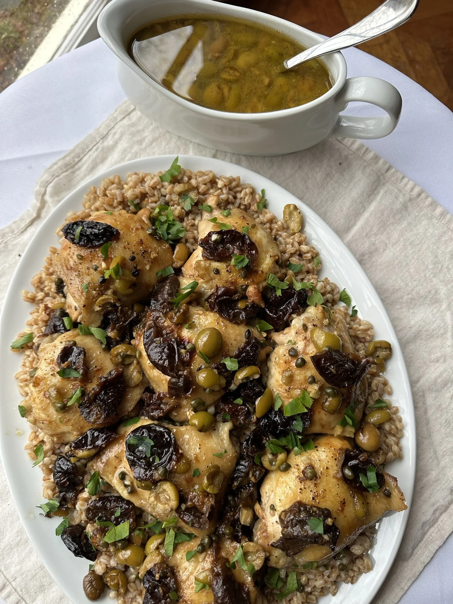 You roast the chicken with prunes, green olives and capers to become this sweet and briny flavor. It makes so much of this delicious sauce to spoon over top, which honestly is the best part for me. We always serve it with a grain of choice like risotto or farro, and it turns out to be the perfect dinner!
