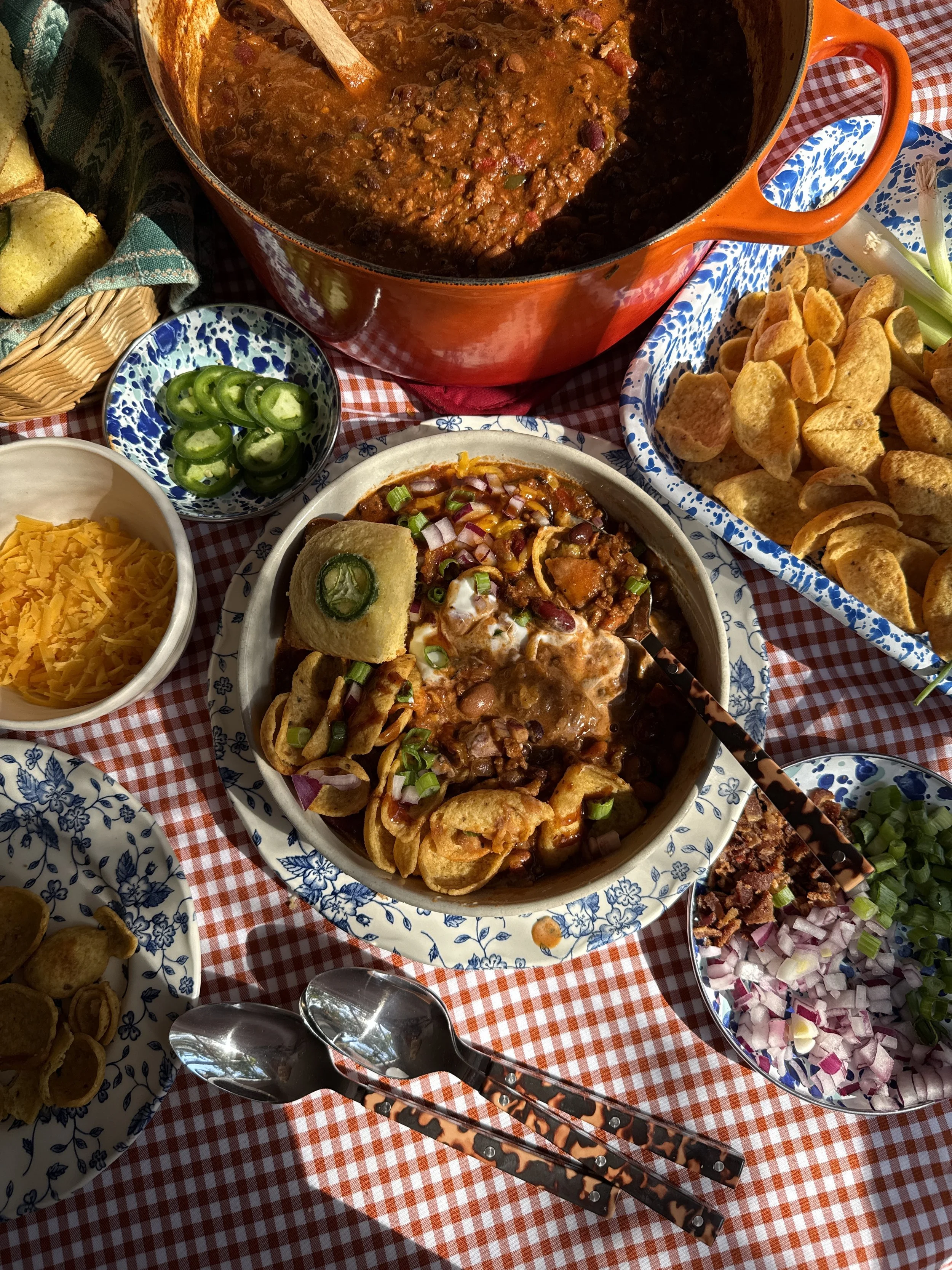 - Serve with more crumbled bacon (necessary IMO). I also topped with Frito scoops, corn bread, sour cream, green onions, red onions, and cheddar cheese. Enjoy!