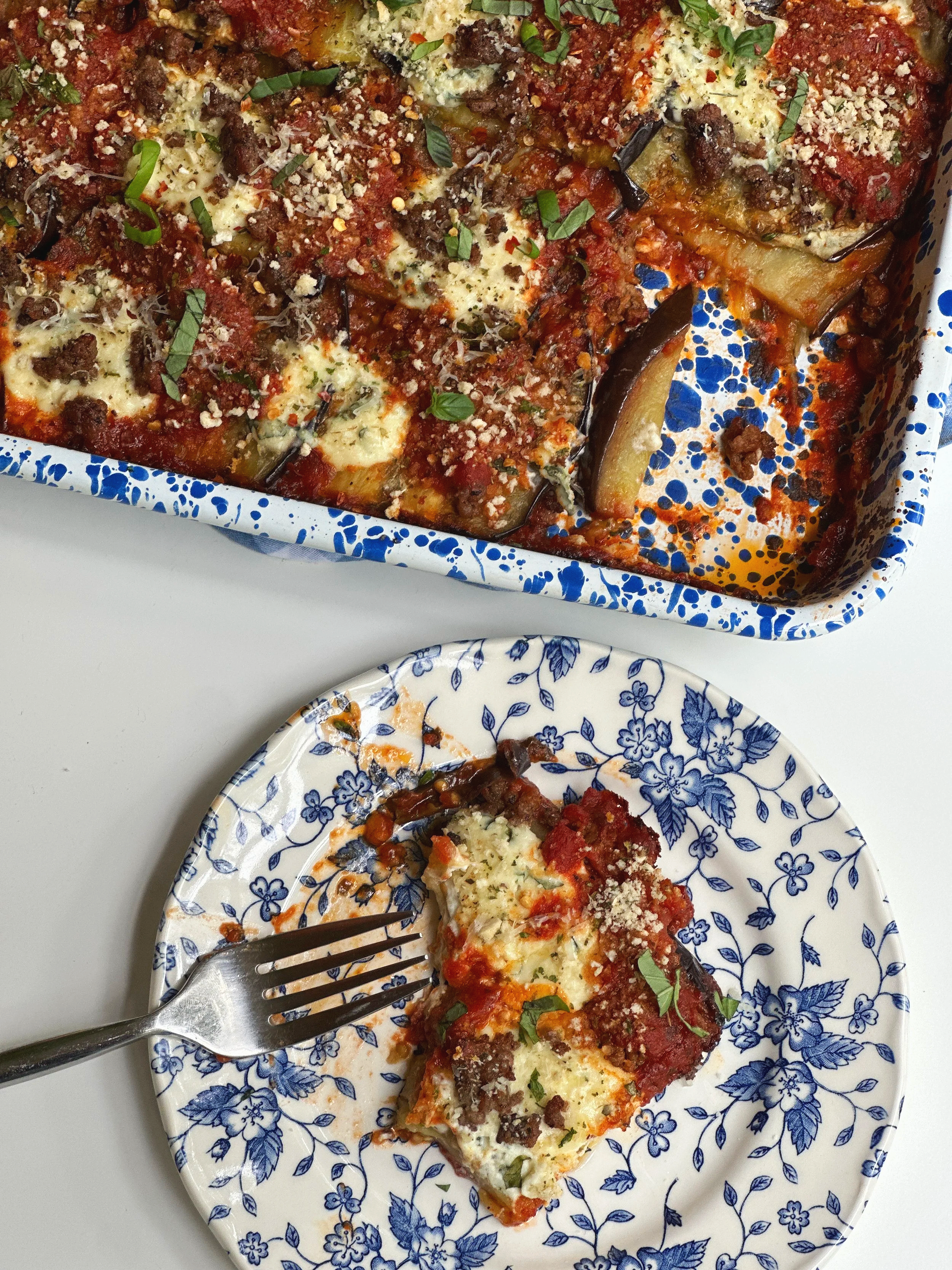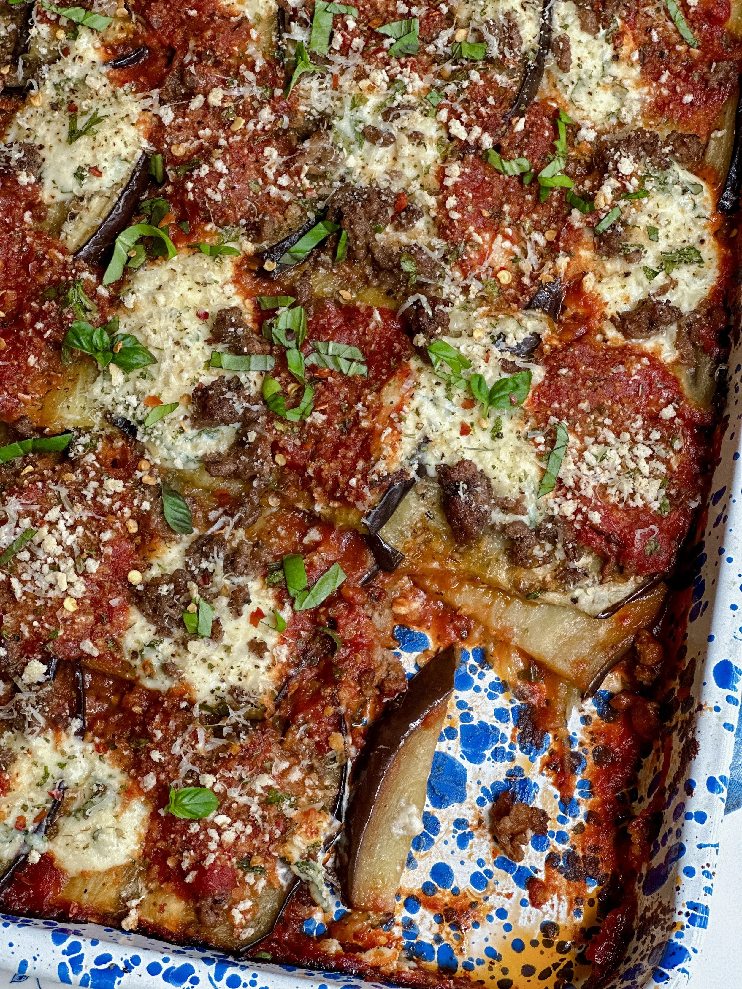 It has all the flavors and elements of a rollatini, just no work! I layer the tomato sauce, roasted eggplant, browned ground beef, ricotta and mozzarella, parmesan breadcrumbs, and fresh basil all onto a sheet pan and then bake until warm and bubbly. It couldn’t be easier!
