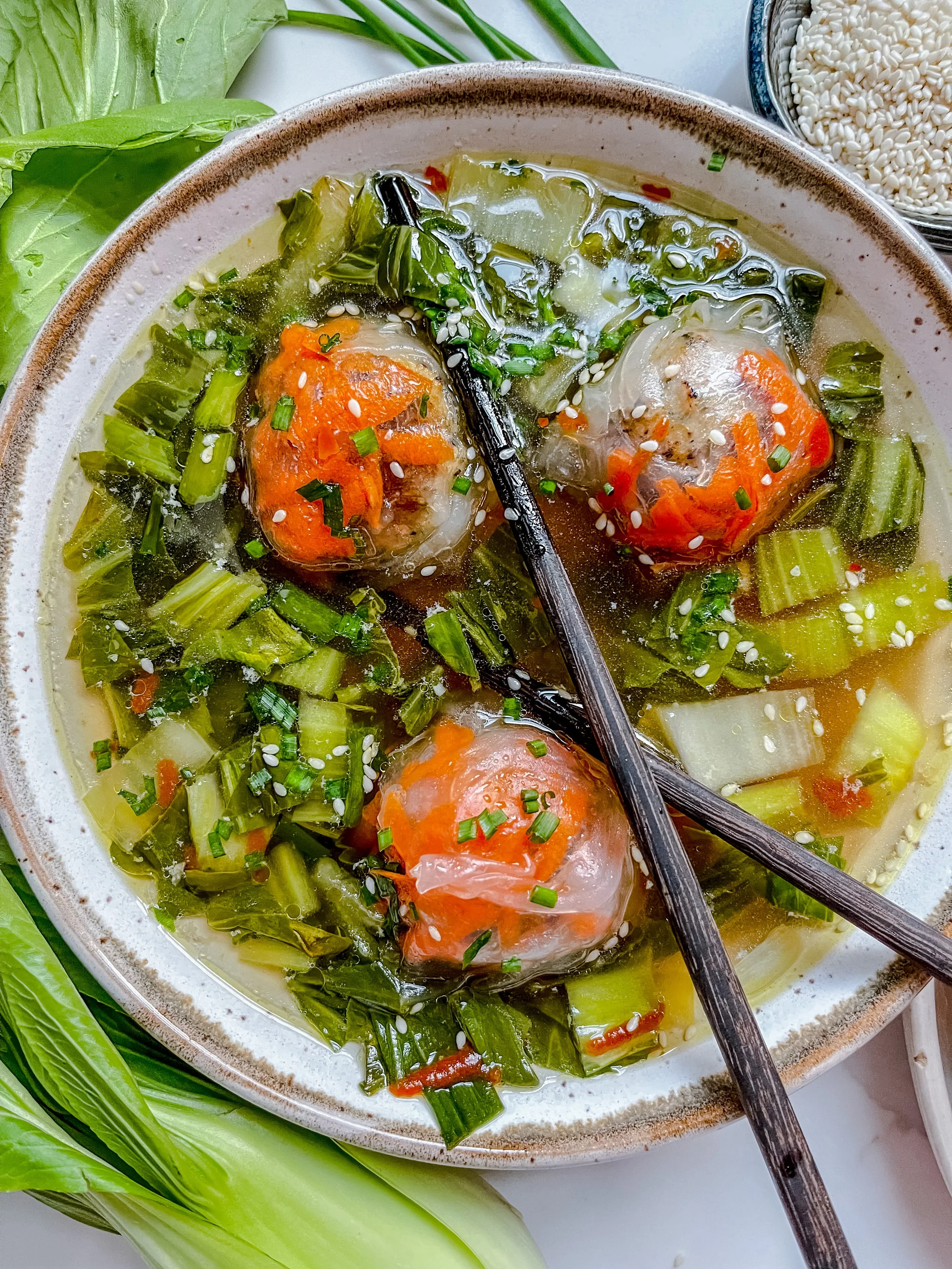 Homemade wonton soup with none of the guilt! We’re using rice paper rolls to wrap my favorite turkey meatballs and some veggies as a substitute for your typical wontons.