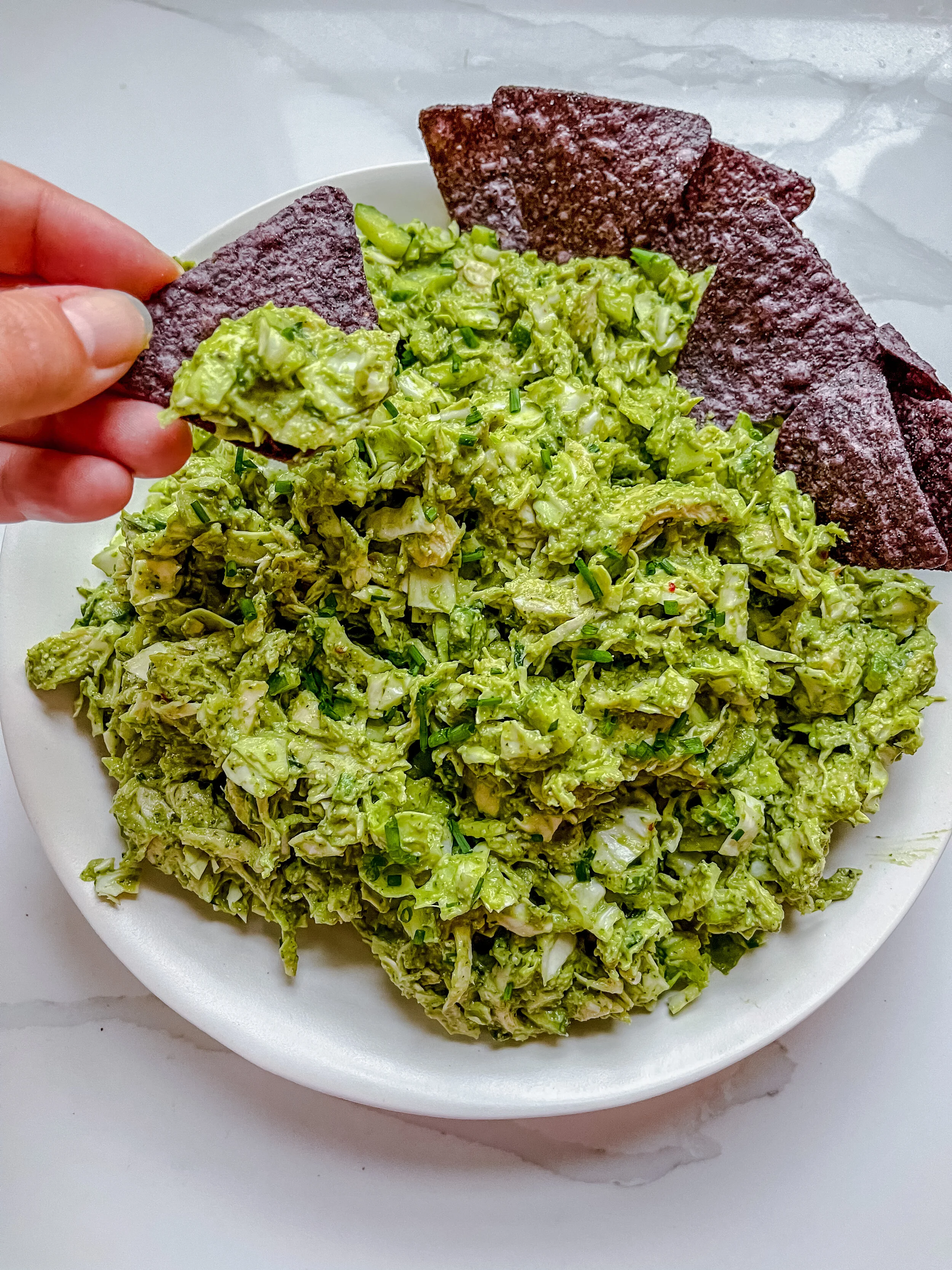 I love making a big batch of chicken salad to have for my lunches all week. It’s so healthy, quick, and delicious! This green goddess chicken salad is exactly the detoxifying lunch I need after a week long of Thanksgiving eating. It fills you up because of the protein and cabbage in it, and tastes amazing with blue corn chips, or even on a sandwich if you prefer!