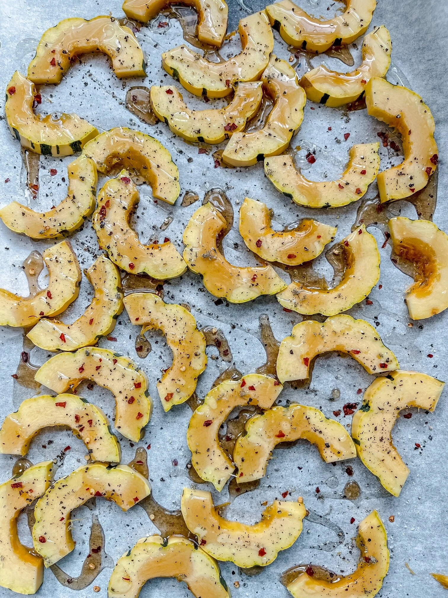 lay them out on a lined baking sheet and toss them with the olive oil, maple syrup, thyme, sage, salt, pepper and red pepper flakes.