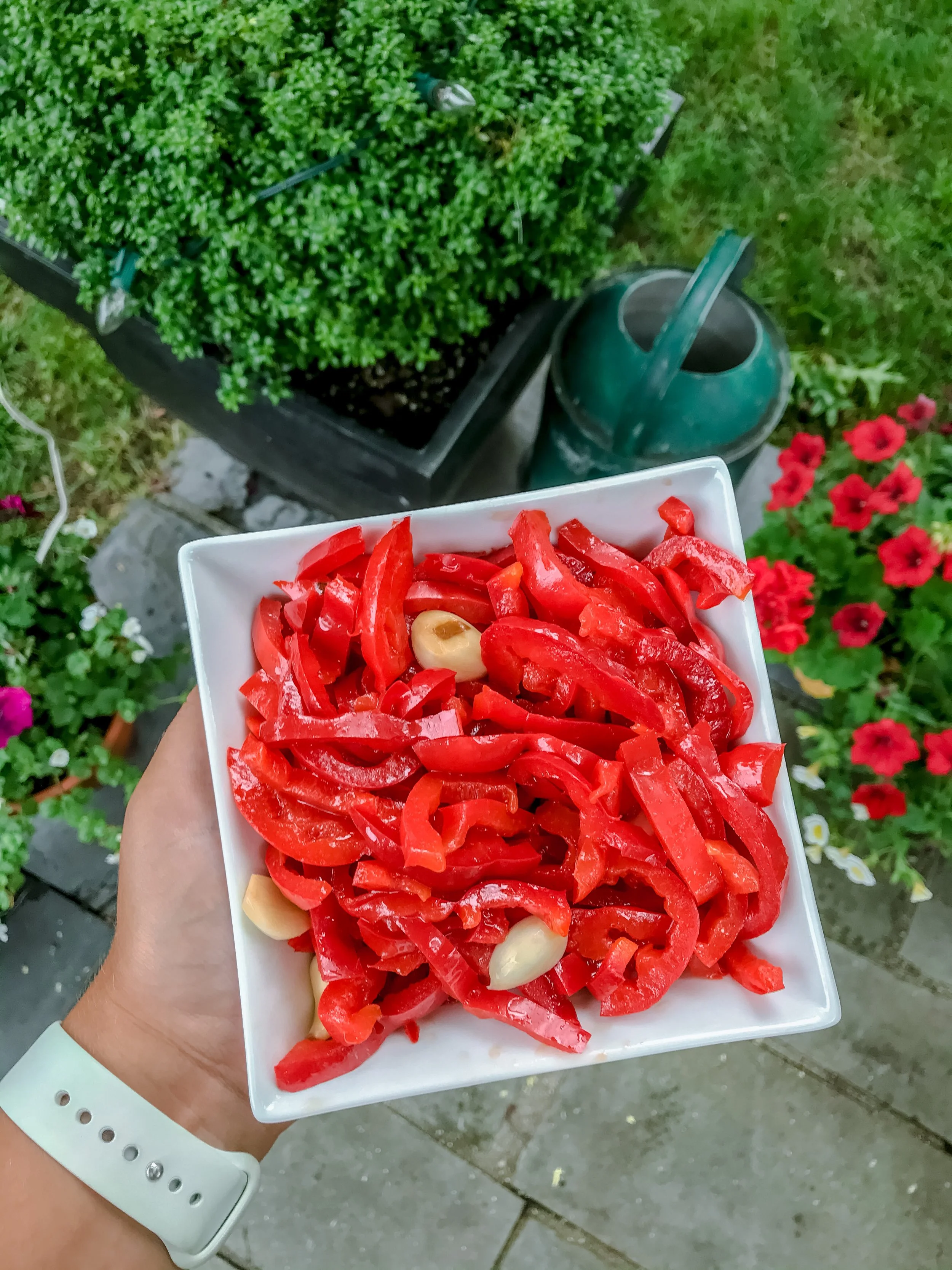 Transfer the peppers to a bowl and sprinkle generously with the salt, add garlic cloves, and pour the olive oil overtop. Mix together, cover the bowl and let them marinate in fridge overnight. (If you want to eat them the same day, you can let them marinate for a couple hour in the fridge before serving them. They’re just better when you marinate them longer).