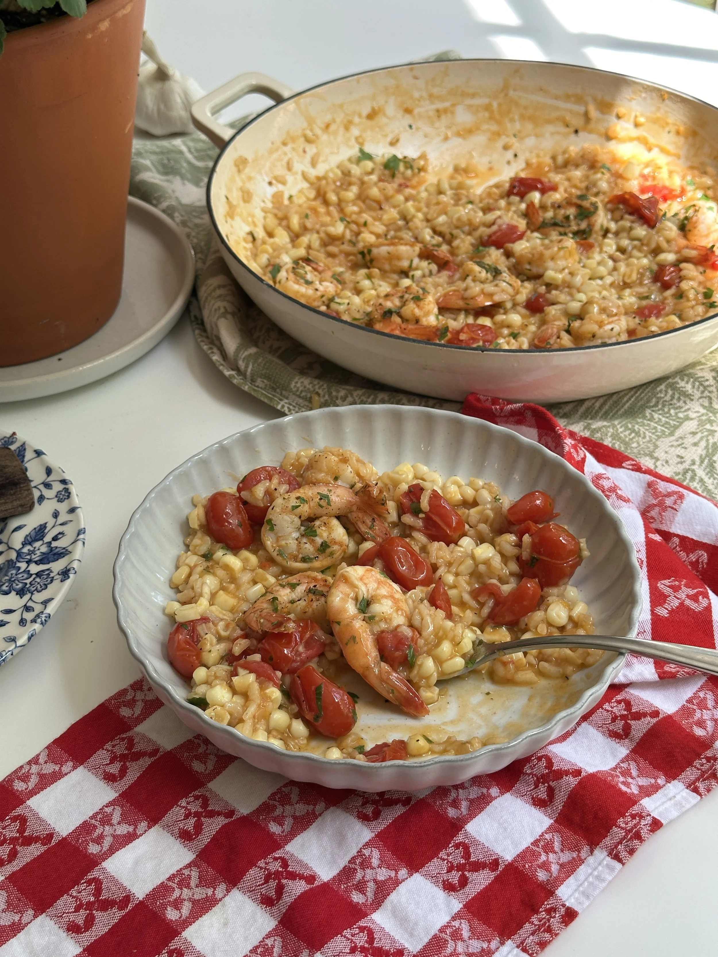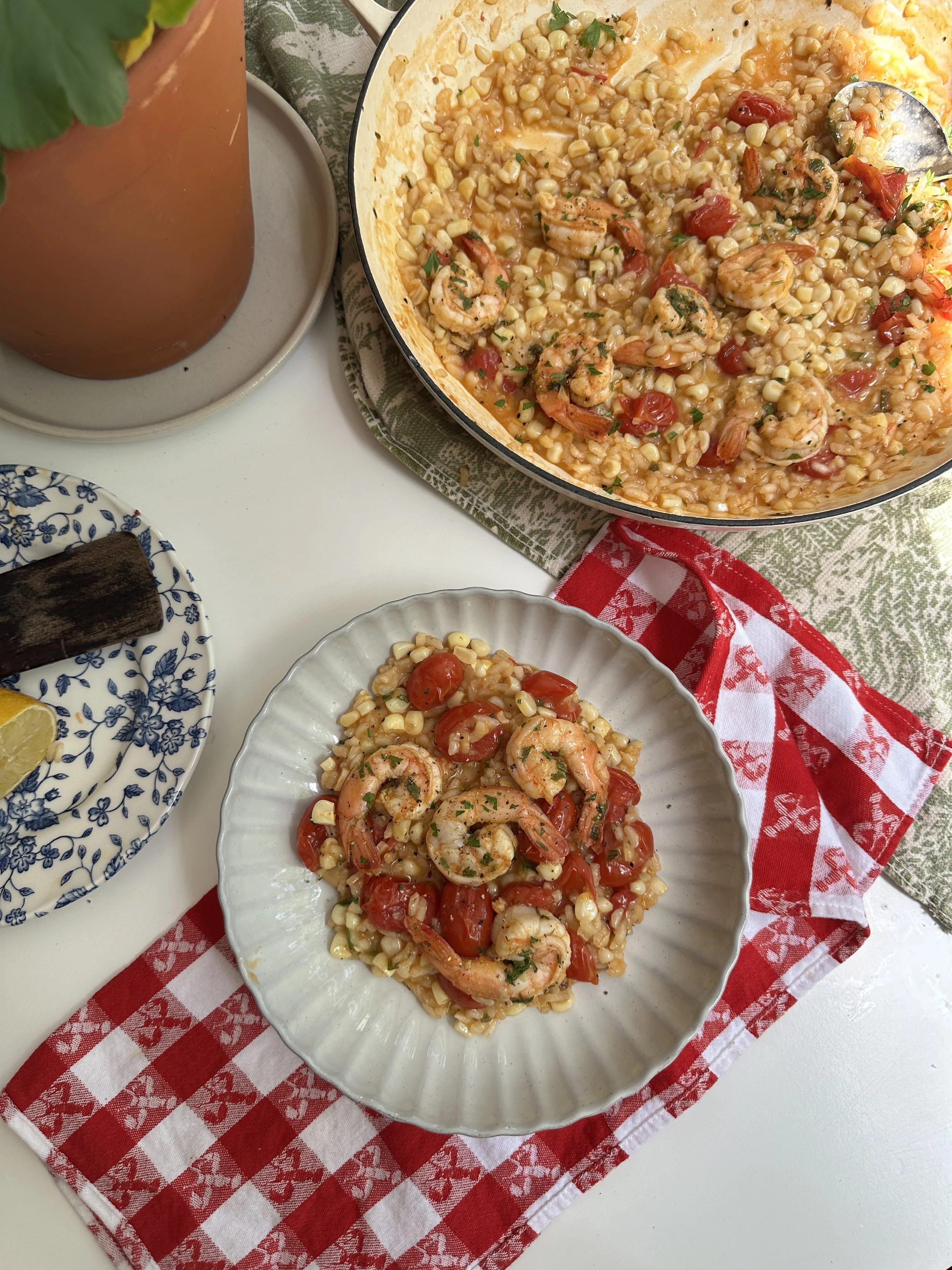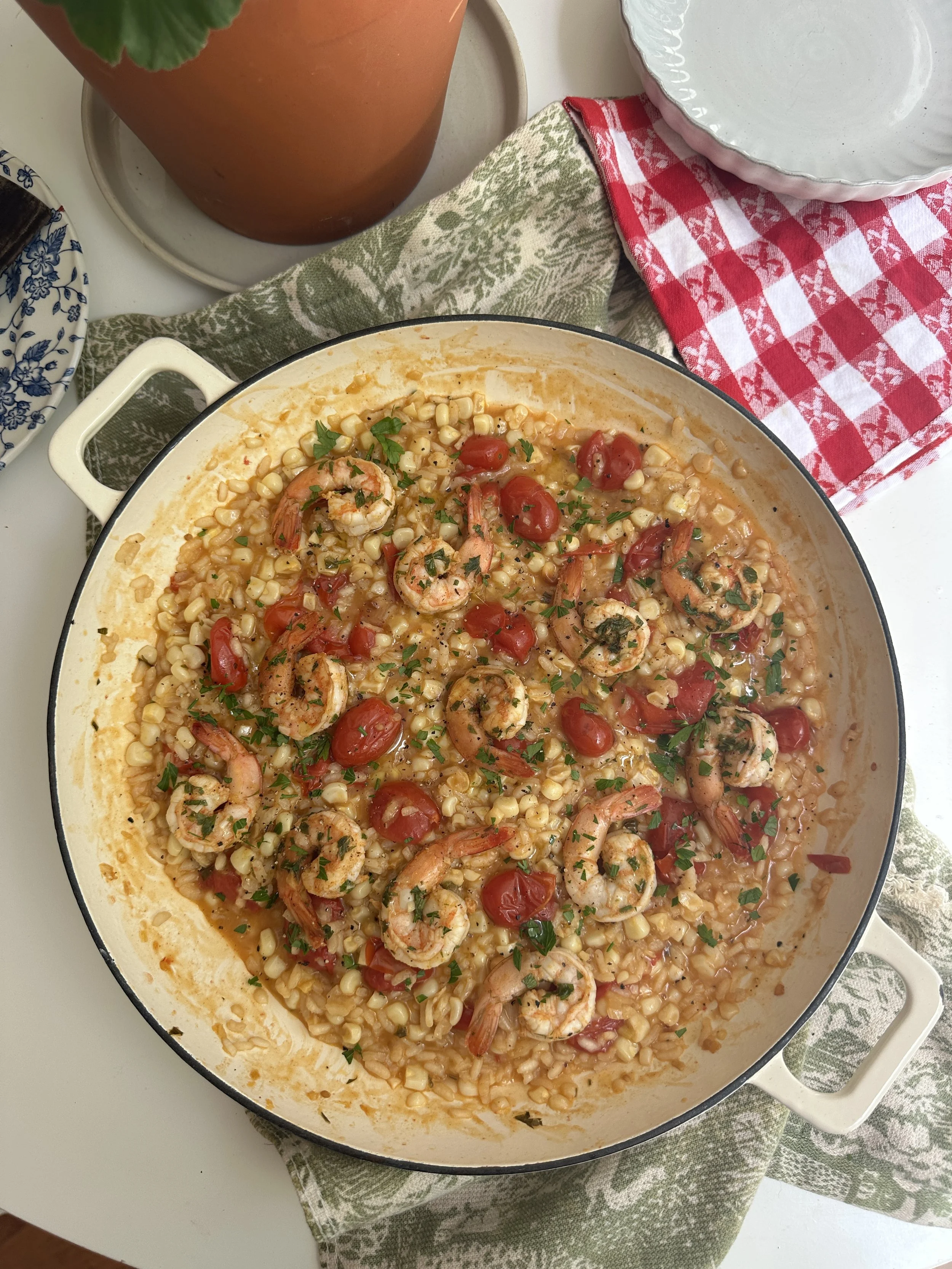 For this end-of-summer meal idea, I wanted to use up these gorgeous cherry tomatoes I had and this super sweet southern corn. I used the corn cobs in the broth to thicken up the risotto and it gives it such an extra layer of flavor and creaminess to it. The cherry tomatoes kind of burst up in the risotto too, so you’re getting all that produce in one bite every time! Grilled shrimp is the perfect pairing for this dish, but you can also pair it with grilled chicken, salmon, or just have it with the protein!