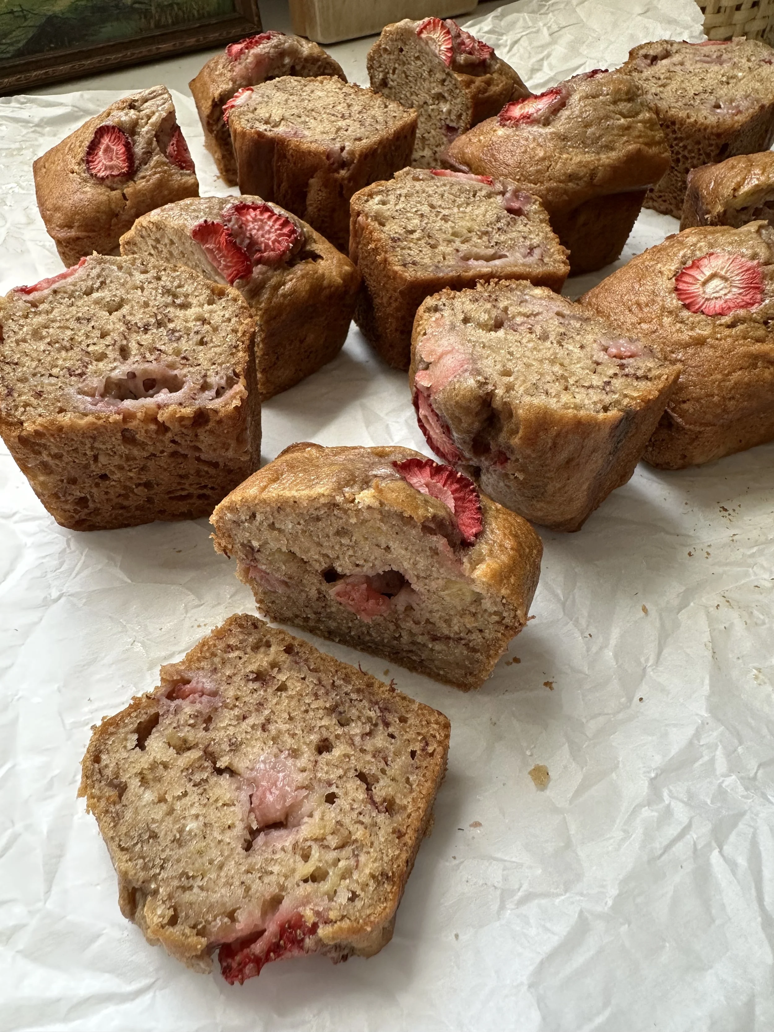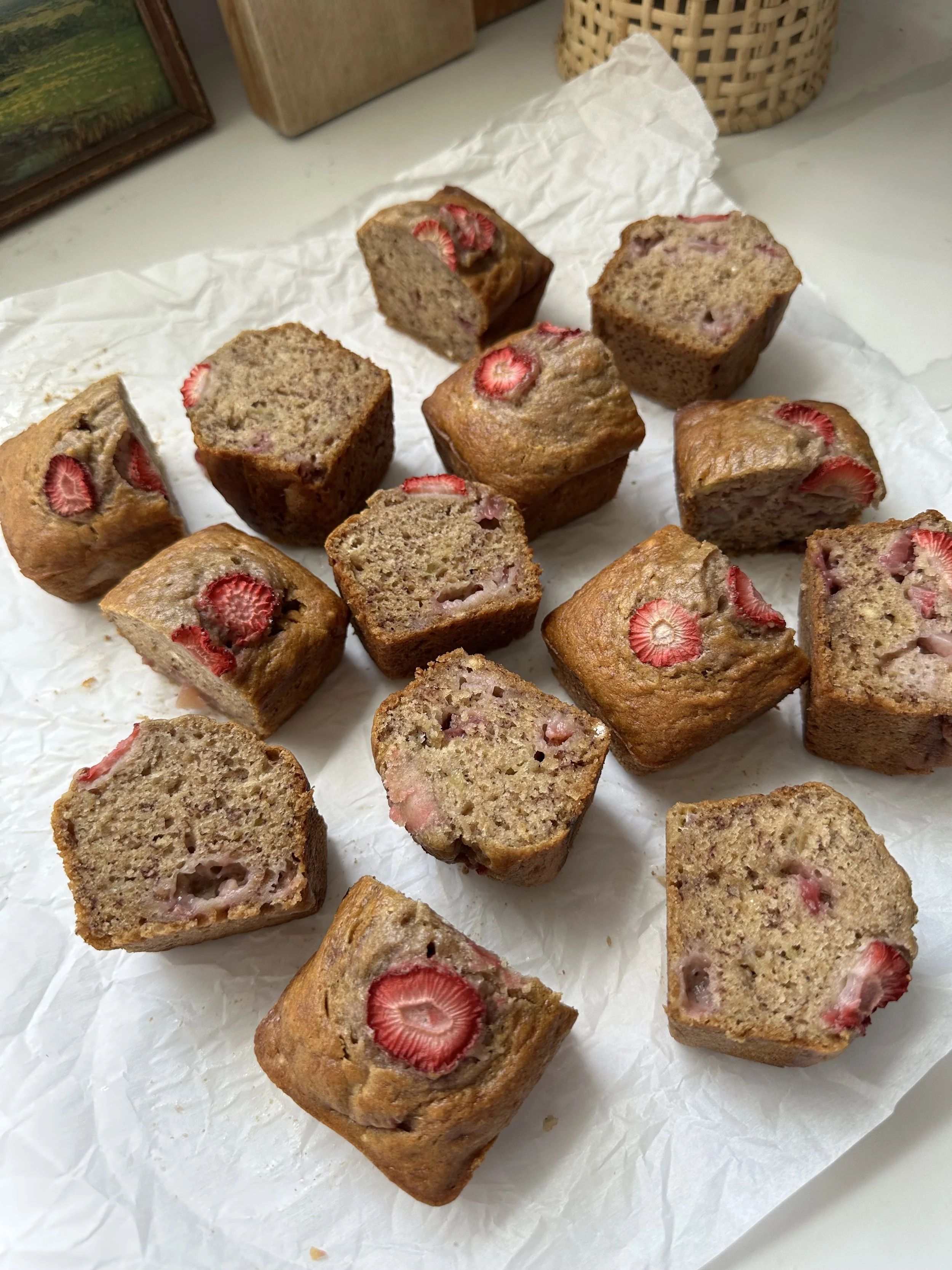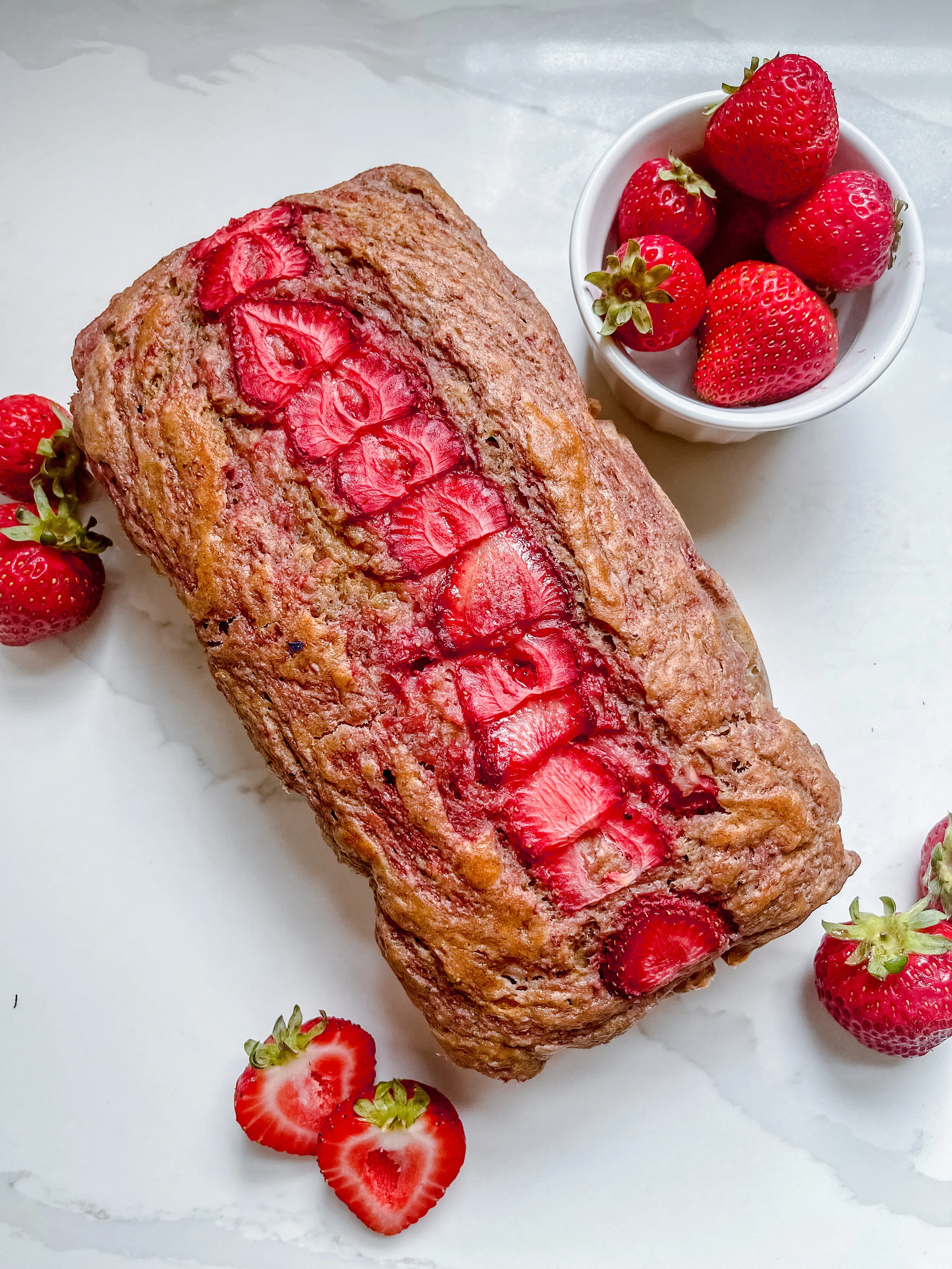The ripe bananas give the same texture as eggs would and you can use any of your favorite plant-based milk. I use strawberries 3 ways in this banana bread - diced inside, pureed, and sliced for the top. The olive oil and pureed strawberries keep this loaf so moist and gives it tons of flavor. A great option to serve this with is diary free whipped cream. You can also mix sliced strawberries, lemon juice, sugar and serve on top of your slice.