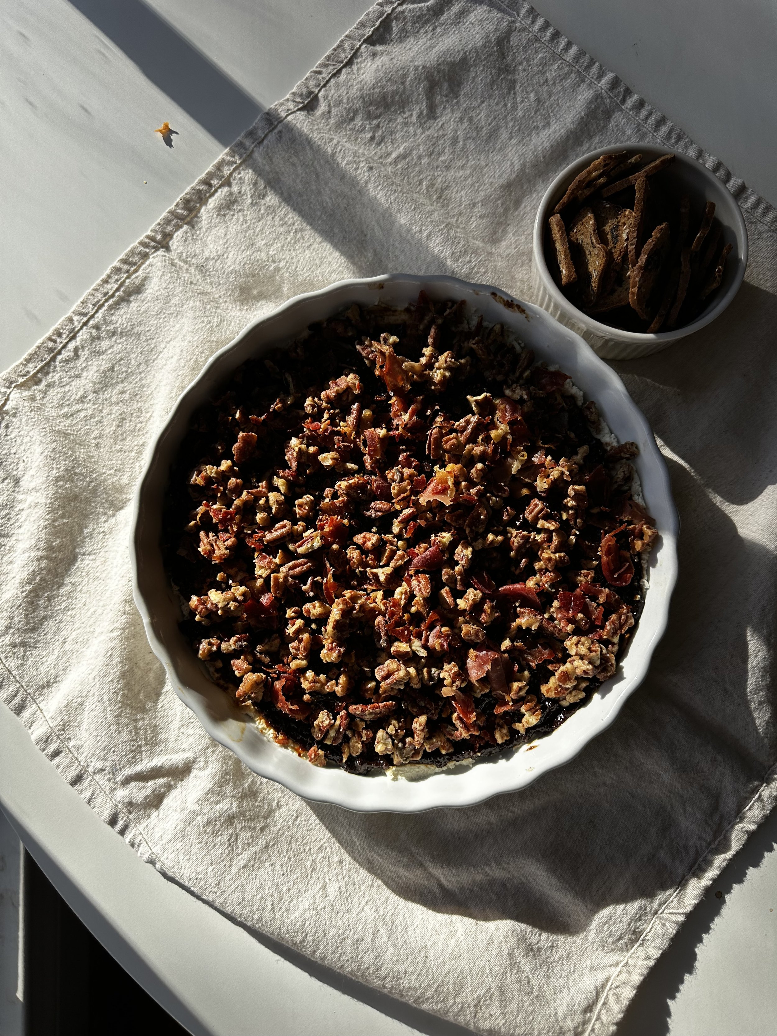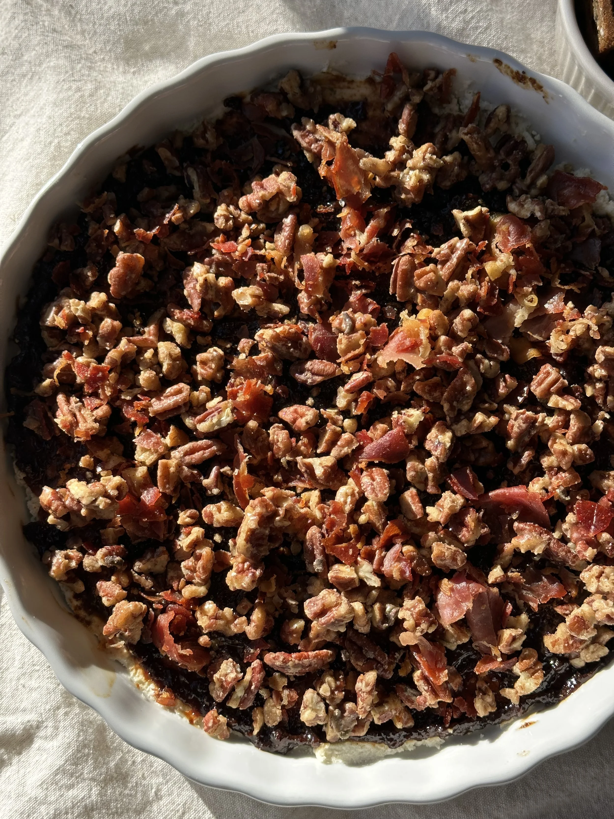 - Assemble the dip by spreading the housing on the bottom of the baking tray. Then spread on the fig jam. Sprinkle the pecans and prosciutto over top.